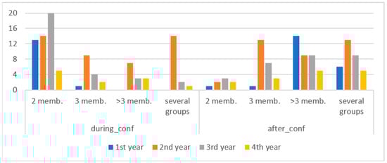 During the confinement, 52 out of the 98 students indicated that they programmed in pairs, 16 in groups of three and 13 in groups of more than three. Another 17 indicated that they were part of several groups of different sizes. However, after the confinement these values changed significantly because most students indicated that they programmed in groups of three or more members (61 out of 102) and only 8 programmed in pairs. The number of students who took part in more than one group also increased to 33 out of 102. Table 4 summarizes these results and Figure 2 shows the distribution of the size of programming groups according to the enrollment year.