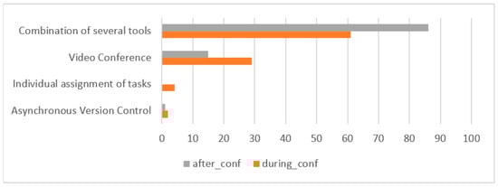 The answers provided to Items 3 and 4 indicate that the solutions adopted to deal with group programming (Figure 3) consisted, mostly, in the combination of various strategies, highlighting the use of some videoconferencing system (being MS Teams (https://www.microsoft.com/en-gb/microsoft-teams/group-chat-software (accessed on 18 July 2021)) and Discord (https://discord.com (accessed on 18 July 2021)) the most cited) together with an asynchronous version control system (GitHub (https://github.com (accessed on 18 July 2021)) was particularly outstanding). Figure 3 also shows that a small number of students used only one tool, being the most cited the videoconferencing systems, sharing the IDE, or the screen or the desktop. It is also interesting to note that after confinement, the vast majority used a combination of several tools, and the individual assignment of tasks was not used. Among those who combined several strategies during confinement, 5 participants in 3rd and 4th year indicated that they used a synchronous collaborative development environment, being CodeTogether (https://www.codetogether.com (accessed on 18 July 2021)) and Codeshare (https://codeshare.io (accessed on 18 July 2021)) the most referenced. However, after confinement that value increased to 26 students: 2 in 1st year, 13 in 2nd, 6 in 3rd, and 5 in 4th.