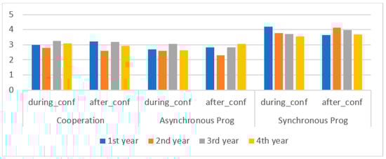 In both situations, during and after confinement, the students expressed the necessity of having tools supporting synchronous distributed collaborative programming. This is reflected by the same value of 4.1 for both means of Item 8, as it is shown in Table 5, which also includes the answers for every enrollment year. It can be observed that during confinement, 1st year students are the most in need of synchronous tools and, after the confinement, 2nd and 3rd year students indicate the greatest need.