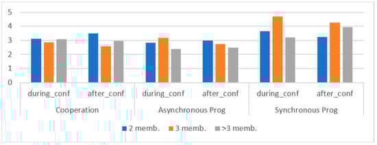 Figure 4 summarizes the mean of the answers related to the participants’ subjective perception of the convenience of applying the three group programming situations described in the previous section (cooperation by work division, asynchronous collaboration, and synchronous collaboration), according to the enrollment year (Figure 4) and to the size of the programming groups (Figure 5). No significant differences are perceived in the answers given by the students before and after the confinement on which is the best strategy to adopt for group programming. The students would rather prefer to collaborate synchronously (Figure 4), which is more evident in those students whose programming group consists of three members.