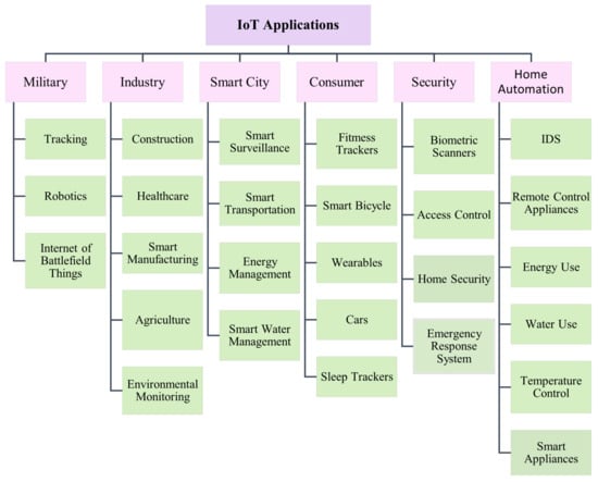 Kevin Ashton used the term “Internet for things” for the first time in 1999. Originally it was called “Internet for things” and then it became “Internet of things”. Since then, this framework became popular for the convenience it brought into everyday life. Today there are billions of IoT devices operating in a large number of fields (Figure 1). Although it is not feasible to discuss all applications of IoT, but Figure 1 shows some fields, including military [29,30], industry [31], smart cities [32], consumer [33], security [34] and home automation [35], and respective IoT applications. With time, IoT has become more human-friendly by processing large amounts of data with minimal human efforts put. Today IoT is not just limited to the personal use, but it is being used to detect weather, monitor surgeries, manage energy, monitor environment and manage transportation.