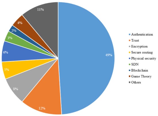 To preserve Confidentiality, infrastructure, data integrity, security and privacy, strong security mitigation mechanisms are required. Figure 3 shows trends of methods used by researchers for countermeasures and mitigation of attacks in IoT. Figure 3 shows that authentication is most popular security technique which is used by 49%, almost half of other techniques altogether, trust management is second most popular technique due to detection and prevention abilities while blockchain is the last.