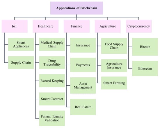 Figure 5 shows some applications of blockchain in different fields, including IoT, healthcare, finance, agriculture and cryptocurrency.