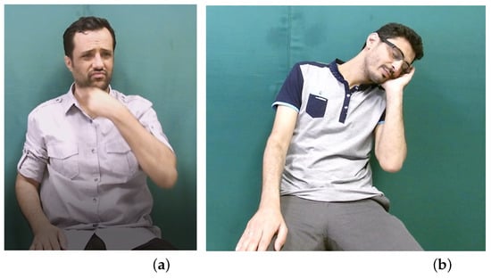 The mArSL database was recorded in an uncontrolled environment to resemble real-world scenarios. The database has been recorded in more than one session to ensure the variability of the signer’s clothes and settings without any restrictions regarding clothes of specific colors. Figure 2a shows the recording room where signers are acting while sitting since the recorded signs require only the face and upper part of the signer’s body. In addition, the distance between sensors and the signer was 1.5 m, which is enough to capture the signer’s body and provide accurate skeleton information.