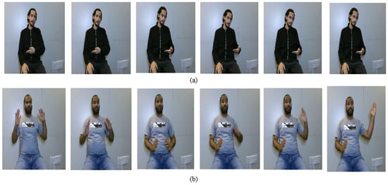 Selected frames of two signs of mArSL database with different number of postures: (a) “HUNGRY” and (b) “VERY SMALL”.