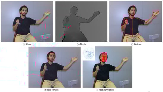 The capturing software packaged with the Kinect device by Microsoft does not align with our requirements of having synchronized recordings of all data sources. To address this issue, we used the tool developed by Terven et al. [44] to capture several modalities synchronously. The recording system was developed using Matlab and provides five modalities for each sign gesture. These are color, depth, joint points, face, and face HD information. The color and depth information were saved in an MP4 format while other modalities were saved as a Matlab matrix. More information about each data modality will be discussed in the following subsections.