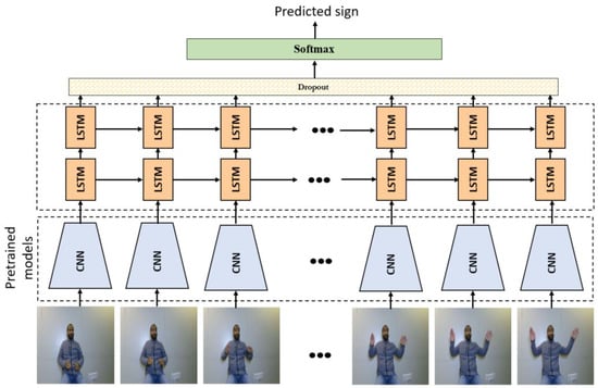 We evaluated transfer learning using several state-of-the-art pre-trained models for spatial information extraction of images. We fine-tuned Inception-V3 [48], Xception [49], ResNet50 [50], VGG-16 [51], and MobileNet [52] models, which were pre-trained on ImageNet for large scale image classification with 14,197,122 images and 21,841 subcategories. In addition, we proposed a CNN model consisting of five layers with a number of kernels ranging from 16 to 64. The first two layers use a kernel of size 5 × 5, while other layers used a 3 × 3 kernel size. These layers were followed by a rectified linear (ReLU) activation function to remove the non-linearity of the input data to this function. We also used maximum pooling layers of size 2 × 2 to down-sample the feature maps. The extracted features were fed into a stacked LSTM consisting of two LSTM layers. Each layer consists of 1024 neurons followed by a dropout layer to reduce the overfitting. These layers were followed by a Softmax classifier. Adam optimizer was used with a learning rate of 0.0001. The framework of the proposed system is shown in Figure 5.
