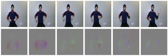 It is also noticeable in Table 3 that the signer-independent mode is more challenging than the signer-dependent one. The sharp decrease in the recognition accuracies with the signer-independent mode can be attributed to the models that started to overfit the signers during system learning. In addition, the variations between signs performed by signers have an effect on the recognition accuracy. To address this issue, we excluded the signer identity information and made the models focus only on the signer’s motion through calculating the optical flow of the input data and fed them into the proposed models. Optical flow provides discriminative temporal information that helps in gesture recognition. We used the Dual TV-L1 algorithm, which is based on the total variation regularization and L1 norm, to compute the optical flow between two image frames [53,54]. Figure 6 shows a sequence of color frames with their optical flows. Table 4 shows the obtained recognition accuracies using the optical flow of color and depth data. As shown in the table, there is a significant improvement in the recognition accuracies of both data representations compared with raw color and depth data. It was also noticed that the optical flow of color data outperformed the optical flow of depth data. In addition, MobileNet-LSTM outperformed all other models with an average accuracy of 72.4% (compared to 54.7% without optical flow).