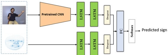 We started by evaluating the facial expressions alone, and then we fused this information with the best model of the manual gesture recognition discussed in the previous section. We used a stacked LSTM model consisting of two LSTM layers with 1024 neurons to learn the temporal information of the facial landmarks. The extracted face features are fused at the classification level with the manual gesture features that were extracted in the previous section as shown in Figure 7.