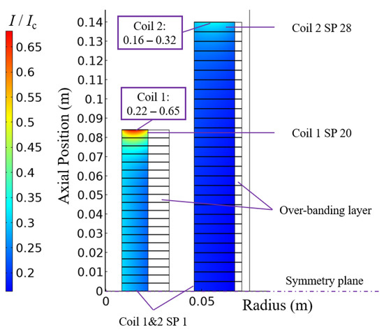 The critical current, Ic, varies at different parts of coils due to the influence of magnetic field. The distribution of I/Ic at Iop = 244 A was simulated to characterize the critical current level of the REBCO insert, as shown in Figure 1, based on the nonlinear fit of Ic (B, θ) data from Ref. [23]. The maximum I/Ic is 0.65 in Coil 1 and 0.32 in Coil 2. The upper pancake coils have a much larger I/Ic, but they are still within an acceptable range.
