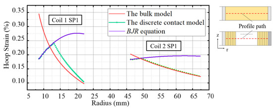 The bulk model assumes that all turns of REBCO coils are bonded together as one single block. The discrete contact model builds up a set of concentric annuli, with simple contact (no friction) between adjacent turns. The simulated hoop strain distribution in the central single pancake of Coil 1 (SP1) and Coil 2 (SP1) are shown in Figure 3, ignoring the effects of screening currents. The strain distribution calculated using Equation (1) is also presented, which assumes that all the turns are discrete [28]