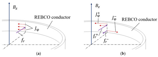 As seen in the uniform current distribution in Figure 4a, a constant force, fr, will be generated under a constant background field, Bz. But considering the screening current effect, radial force fr in the REBCO conductor will distribute unevenly, and even reverse in the tape bottom half, as shown in Figure 4b. The maximum radial Lorentz force can be estimated by [33]