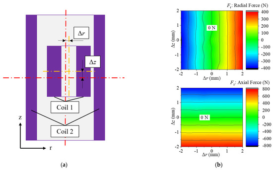 The simulation of unbalanced force on Coil 1 caused by the misalignment of two coils. (a) Schematic diagram of misalignment in coils. (b) Simulation results of the radial and axial unbalanced force between two coils.