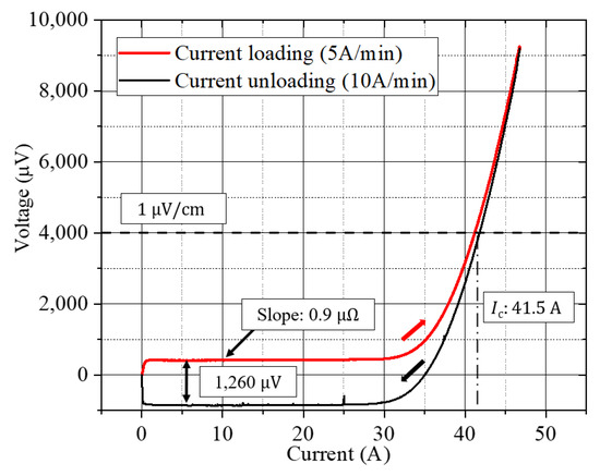 The transport test was carried out at 77 K to measure the critical current and the total internal resistance of an individual double pancake. A representative test result is shown in Figure 8. During the test, the transport current was loaded at a speed of 5 A/min. After the voltage reached the 1 μV/cm criteria, the current was unloaded at a speed of 10 A/min. The double pancake’s critical current is 41.5 A at 77 K. Due to the loading process being continuous, an induced voltage appeared, and the self-inductance is calculated as 5 mH. The slope of the curve in the superconducting zone reveals that the double pancake has a total internal resistance of 0.9 μΩ. This consists of the inner joint resistance and the turn-to-turn resistance in the NI coil.