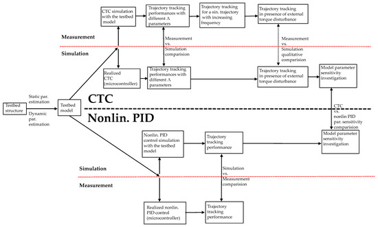 The methodology followed in the article is as follows: first, a simple real-world testbed for control algorithms is introduced and its mathematical model is constructed based on various parameter estimation measurements (Figure 2). Then, the performance of the one-parameter CTC algorithm is studied by comparing the simulated and measured (when the algorithm was running on a microcontroller, controlling the real-world testbed) trajectory tracking results. Further experiments were carried out on the real-world testbed showing trajectory tracking with alternative trajectory profiles (sine signal with increasing frequency). The resistance against outer disturbances tested with simulation and measurement as well and the results were compared qualitatively. Besides that, an alternative, more traditional control method (PID compensator with nonlinear feedforward term, referred to as “Nonlin. PID” in Figure 2) is also tested for trajectory tracking by simulation and measurement. Finally, the robustness of CTC and “Nonlin. PID” methods against model parameter variations (when the controller, tuned for the original plant model, interacts with a plant with altered parameters) were compared using the simulational results of the two methods.