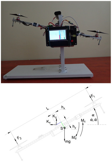 To justify the practical usability of the proposed one parameter CTC scheme, a simple twin-rotor experimental test stand was built, consisting of a beam rotating in the vertical plane around a horizontal axis in the vicinity of its middle point. The angular position of the arm—which is the controlled variable—can be varied by a control torque exerted by two propellers at both ends of the rod. Propellers were driven by electric motors with variable rotational speed, which can be regulated by a Pulse-Width Modulated (PWM) electric signal. The test platform is also equipped with a programmable microcontroller board on which the control algorithm can be implemented and executed in real-time. A photograph of the device and free body diagram of the arm belonging to the testbed is shown in Figure 3. Basic information about the main components of the device is summarized in Table 1.