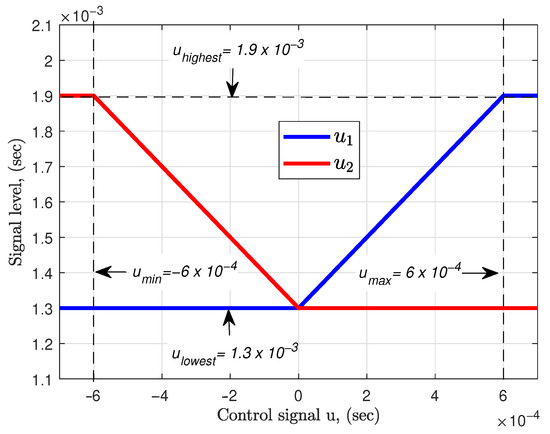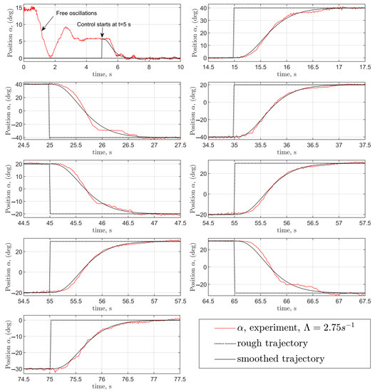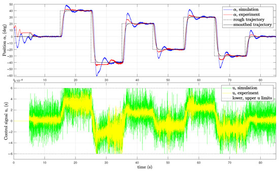 In the first 5 s of the operation, control signal u is set to zero resulting in s signal levels for the left and right motors. This phase is used for spinning up the rotors to reach their lowermost effective actuation levels (see Figure 4). During this short “spinning up” phase, the arm executes small-amplitude free oscillation and the position is not controlled. Meanwhile, the measured angle is fed into the smooth trajectory planner, which thereby will be ready to generate a smooth transition path to the desired commanded position, when its output is already connected to the rough trajectory generator after 5 s. The measured transition between the uncontrolled first 5 s and the controlled state on the real physical system is also outlined later in the upper left graph in Figure 10.