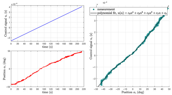 Stationary states can be closely resembled, when input signal u is increased linearly over time with a very small rate of change while the measured values are also captured during the experiment, as depicted in Figure 5. The connection between cohesive value pairs can be well approximated by a fourth-order polynomial function , which is considered as the static characteristic of the bi-rotor testbed: