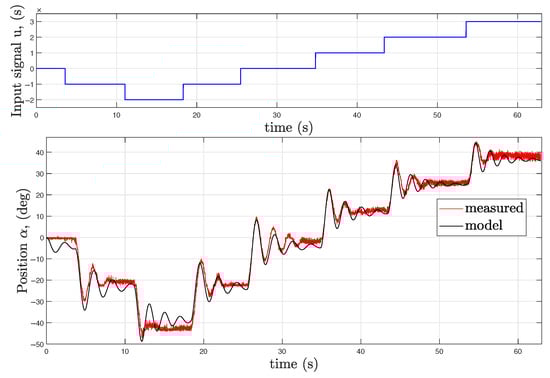 After the experimental determination of the static behavior, dynamic parameter values for and d are fine-tuned to match with the experimental step response results (Figure 6).
