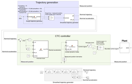 The details of the realized CTC control scheme as it was first tested in Matlab Simulink is illustrated by Figure 7. For generating the rough nominal trajectory, the desired angular position was changed according to a predefined time schedule (0 degrees for 15 s, than and 0 degrees for 10–10 s). From these rough values, a smooth time-dependent path is generated by the smoothed trajectory generator, which consisted of four first-order serially connected low-pass filters with time constants of 0.2 s. This step is essential, since the second-order temporal derivative of the nominal position () has to be finite and two times continuously differentiable function which can be fed to the kinematic block (described by Equation (10)) to calculate the desired angular acceleration value .