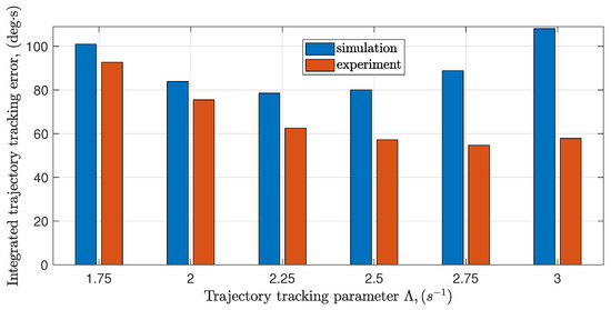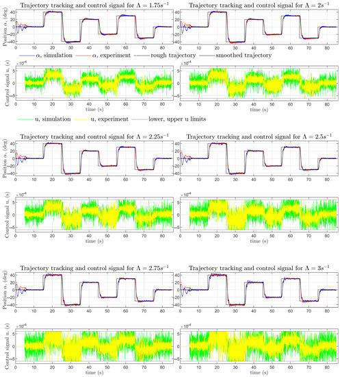 Time series of the captured simulated and experimental data are compared in Figure 8. Good quality trajectory tracking was achieved in general both for simulated and experimental cases. The only appreciable difference between simulations and experiments is the behavior during the uncontrolled phase in the first five seconds, which can be explained by the fact that one of the rotors starts to spin slightly earlier (about 0.3–0.5 s) than the other, resulting in a short living non-zero torque acting on the beam. In the plots depicting control signal variations, upper and lower limits ( s, s) are outlined by a dashed line. The CTC algorithm results in highly fluctuating control signals for all scenarios. However, the wobbling in seems to be more intense in simulations, since the sensor noise level was slightly over-estimated. As the parameter increases, fluctuations become more and more significant, as well as more likely tending to saturate at the limits of the usable signal range.