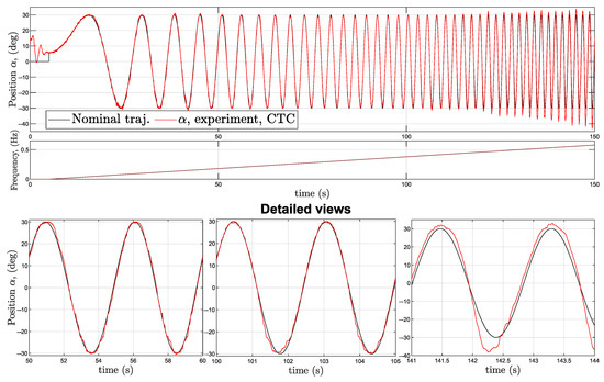 To show that the proposed CTC scheme is not optimized just for a certain specific nominal trajectory, s−1 experimental setting is also tested in the frequency domain by applying a sinusoidal wave as the desired path with a decreasing time period known as “chirp signal” (see Figure 11). Frequency is increased linearly over time from 0.001 Hz to 0.57 Hz, the peak-to-peak amplitude was 60 degrees with −30 minimal and +30 maximal values. The smooth transition between the controlled and uncontrolled phase is achieved by phase-shifting of the initial sine wave to match the last measured angle value at the end of the five seconds long “free oscillation” period. The trajectory tracking is almost perfect up to 0.3 Hz and a still acceptable quality path following can be observed up to 0.45 Hz (as a comparison: the natural frequency of the abandoned system, when oscillating freely is around 0.5 Hz). Low-grade path fidelity can be observed from 0.45 Hz to 0.65–0.7 Hz; stability loss is occurring around 0.75–0.8 Hz.