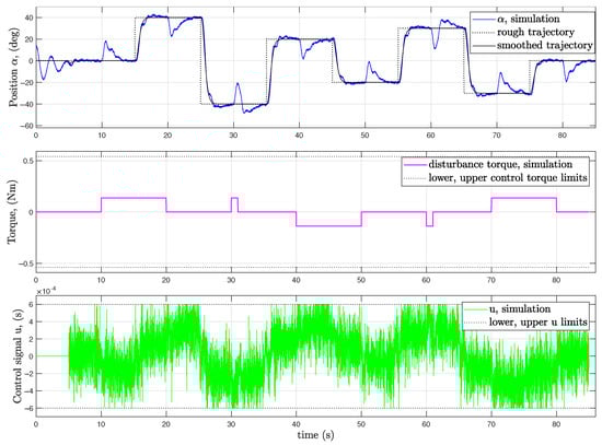 The change in the quality of trajectory tracking under the influence of external disturbance was first investigated by simulation (Figure 12). The duration of the applied external disturbance torque was 10 or 1 s, and the absolute value was one-third of the maximal achievable control torque (which is exerted when the lowest or the highest control signal values are sent permanently to the input signal distribution function depicted in Figure 4). When both short and long-duration disturbances occur or are removed, a transition period of about 10 s is needed for the algorithm to bring the controlled variable back to the vicinity of the prescribed nominal path.