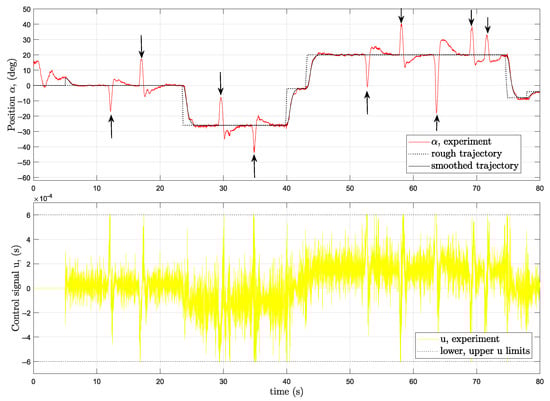To show that the effect of external torque perturbations is also neutralized in real life, “qualitative” measurement series were elaborated, where the external disturbance was induced manually by pushing one of the arms belonging to the test stand arm (the measured results are shown in Figure 13, a similar magnitude of torque to the simulated disturbance could have been achieved by suspending weights to the arm, but the coordination of the weights’ loading and unloading with the simulation load timing would have been too complicated). Each manual push lasted about 1 to 3 s. It is worth mentioning here that, in this experiment, the nominal trajectory was not predefined, but was generated in real-time by the microcontroller based on rough trajectory data provided by an incremental encoder knob. Each time, the experimenter turned the encoder knob by one position, the rough trajectory increased or decreased by 2 degrees, and this was fed to the smoothed trajectory generator.