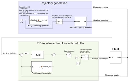 Since (see Equation (22)), the troublesome nonlinear part is canceled out and the resultant model can be further treated as an LTI system. Deficiencies of the actuator dynamics (dead-time, rise time) can also be compensated up to a certain limit by appropriate choice. The Simulink model of the realized “PID with nonlinear feedforward” control scheme is depicted in Figure 14, where the feedforward linearizator block contains formula and the smoothed trajectory was generated in the same way as was done previously in the case of the CTC method.