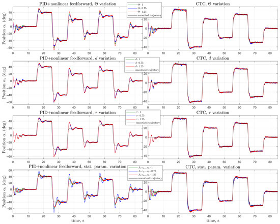 To test the robustness and model parameter sensitivity of the two different proposed control schemes, a set of simulation studies were performed, where the original control scheme interacts with altered virtual plant versions (Figure 16, for CTC, s−1 case was chosen as the “original” controller since it had the smallest absolute integral error value). In the first set of simulations, only inertial parameter was varied by relative to its identified value in Table 2; in the second set, only the viscous parameter d was varied by ; in the third set, only time-delay was varied by , and, finally, in the fourth set of simulations, all “static parameters” including were altered by at the same time in the plant model, while other system parameters were kept at a constant value.