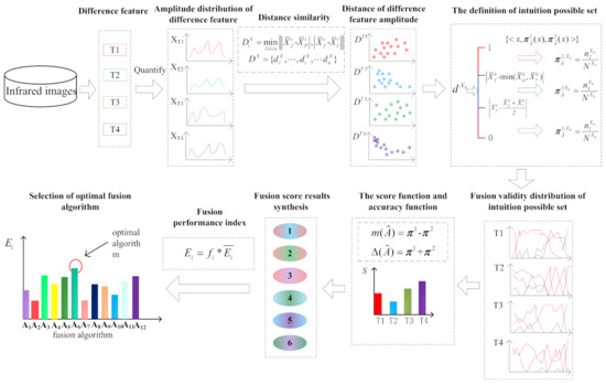 Aiming at addressing the problem whereby existing image fusion models cannot reflect the demand of diverse attributes (e.g., type or amplitude) of difference features on algorithms, leading to poor or invalid fusion effect, this paper puts forward the construction and combination of difference features fusion validity distribution based on intuition-possible sets to deal with the selection of algorithms with better fusion effect in dual mode infrared images. Firstly, the distances of the amplitudes of difference features between fused images and source images are calculated. The distances can be divided into three levels according to the fusion result of each algorithm, which are regarded as intuition-possible sets of fusion validity of difference features, and a novel construction method of fusion validity distribution based on intuition-possible sets is proposed. Secondly, in view of multiple amplitude intervals of each difference feature, this paper proposes a distribution combination method based on intuition-possible set ordering. Difference feature score results are aggregated by a fuzzy operator. Joint drop shadows of difference feature score results are obtained. Finally, the experimental results indicate that our proposed method can achieve optimal selection of algorithms that has relatively better effect on the fusion of difference features according to the varied feature amplitudes.
