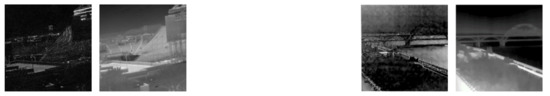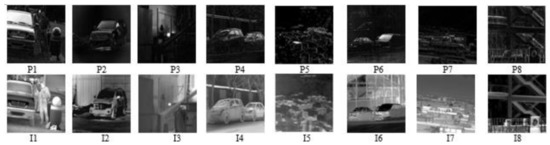 The main reason for the formation of the difference features is that there are differences between the types of imaging characteristics, including the radiation difference between the target and background, the atmospheric transmission difference and the imager response difference. It can be seen from eight groups of closely registered infrared polarization and intensity experimental images (with a uniform size of 256 × 256) in Figure 2 that the infrared polarization images have sharp edge feature details, etc., but lack sufficient brightness characteristics. Infrared intensity image information based on thermal radiation luminance characteristics is significant, but lacks sufficient edge and detailed features. Thus, the difference in the infrared polarization and intensity image, edge features and details are evident. The difference feature selected in this paper includes gray mean, standard deviation, edge intensity and spatial frequency. These are defined as follows:
