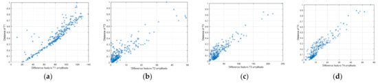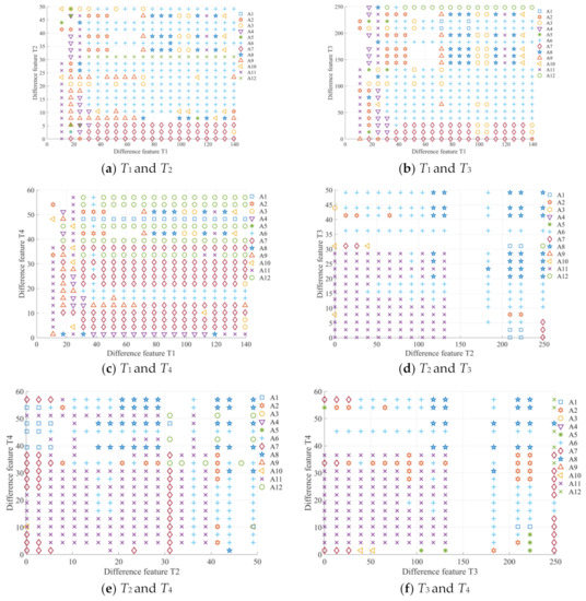 Discrete points figure of the distance of the four types of difference feature. (a) difference feature T1; (b) difference feature T2; (c)difference feature T3; (d)difference feature T4.
