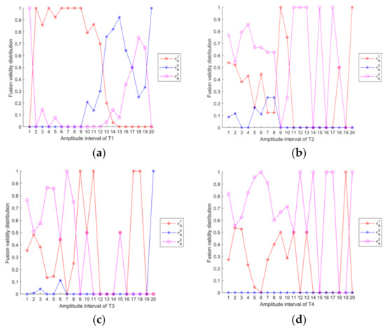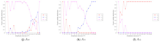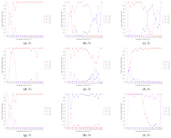 Then, fusion validity distribution of intuition possible set can be obtained as shown in Figure 4. Similarly, we can get the fusion validity distribution of each difference feature to A1, A2, A3, A4, A5, A6, A7, A8, A9, A10, A11 and A12. Take difference feature T1 as an example, Figure 5 shows fusion validity distribution of difference feature T1 to different algorithms.