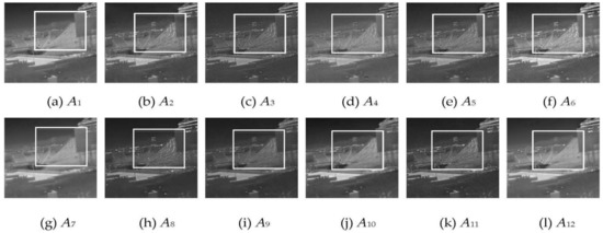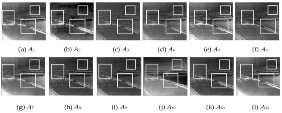 We adopt both subjective and objective assessment to analyse the fused results with the algorithm selected by the proposed fusion validity distribution construction and combination method. It can be observed from Figure 10 that the fusion results of A1, A6 and A12 algorithms can retain the brightness of infrared intensity image, while the other fused images are dark as a whole. Under the premise of preserving the fused images with high brightness and contrast, algorithm A6 has better texture detail and edge contour (particularly the box region of Figure 10) preservation performance, also it has better visual effects and resolution. For the box region with great difference of source image in Figure 11, algorithms A5 and A6 have better visual brightness, contrast, texture details and edge profile edge contour preservation performance than the other algorithms, particularly the A5 algorithm, which preserves the texture details completely. The other fused images are dark, leading to poor human visual effect.