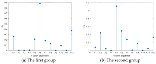 Ei of different fusion algorithms of two groups.