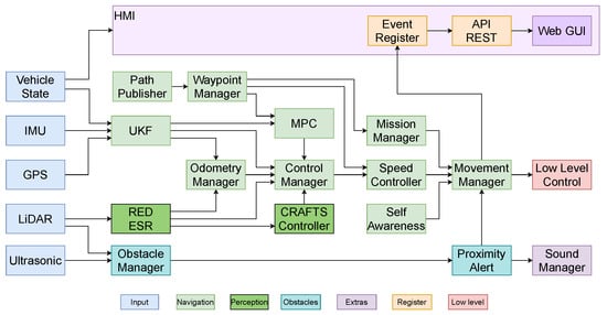 Figure 2 shows the workflow of the system. The information acquired from the sensors is transformed and fed into the processing nodes, then the filtered and sensor data is used to generate proper solutions dependent on the environment and the vehicle situation on the road. After these processes are completed, all the information is sent to the managers and, as a final step, the control commands for the low-level controller are generated to move the platform. It is necessary to remark the importance of the managers in the system to allow or select which traffic/sensor information will be used. Although some nodes are always generating the control information, the managers allows the forwarding of the control commands to the lower level only if several conditions are fulfilled; these conditions depend on the solutions established, computed and confirmed by each system node assigned to a specific task. For example, the Odometry manager decides which control is in charge of vehicle movement, which is either the MPC (Model Predictive Controller) or the Reactive Road Controller, and their actuation will depend on the degree of trust (Score) the system computes from sensor data. This paradigm of workflow is used for decision making within the system for the vehicle to decide the methods for controlling the platform depending on the situation.