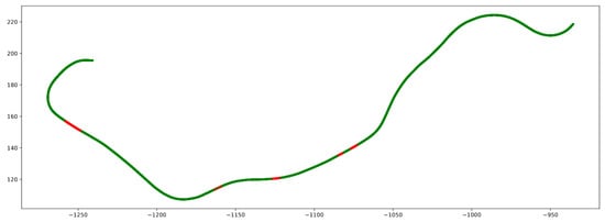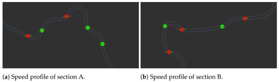 By analyzing the curvature profile, straight sections on the road are identified as those with curvature radius that approach infinity, whereas the curvature radius in turns can present very different values that can be close to 0 in extreme cases. The first approach is to define the speed in straight sections as the maximum desirable speed and to define a variable speed in turns depending on their curvature radius. After this and for safety reasons, the speed is reduced in the proximity of turns. To reduce the size of the speed profile to only the relevant indexes of the path where the speed must change, filtering is performed so that the path is reduced to single-speed sections. Figure 17 shows a two-path section processed to generate the speed profile. Each section the path is presented as a finite set of poses and the speed assigned to each sector as green circles (if it is an acceleration sector) or red circles (if it is a deceleration sector), the # means the speed sector number used to track and test the profile.