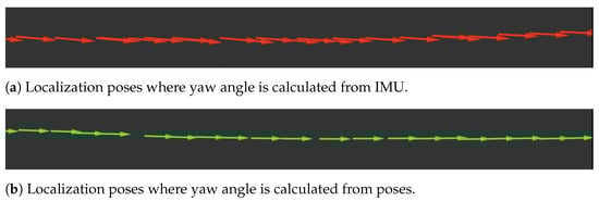 Together with position, a reliable orientation is essential for good control of the vehicle. The use of an Inertial Measurement Unit (IMU) can improve the UKF fusion by including rotation speeds and linear accelerations. High-performance IMU usually includes a magnetometer sensor that can provide orientation information by measuring the Earth’s magnetic field. However, magnetometers need a good calibration that is usually performed by turning the sensor attached to the vehicle in different directions. The impossibility of performing that with the project’s vehicle due to its high weight results in poor calibration of the sensor and, consequently, a low accuracy of the yaw angle measure that adds a random offset to the angles as shown in Figure 4a. On the other hand pitch and roll angles are stable as they do not depend on magnetometer and those angles are used in the UKF.