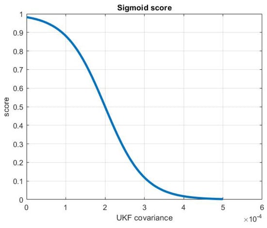 This module is in charge to analyze the odometry provided by the localization package. The input is taking into consideration the covariance of the UKF output and providing a simple score showed in Figure 5. The score is generated with the sigmoid formula (6) where the values a, b and c are the result of experimental analysis where the covariance and uncertainty start rising due to different factors such as DGPS lost signal, 4G lost signal, IMU interference and noises. The score value generated is used later to select which type of control will be used and is based on localization or the reactive one based on road detection.