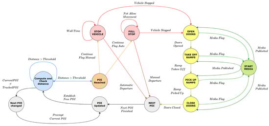 The goal in this particular case is defined in two steps: The first step is reaching a POI, that is, the distance between the platform and the POI must be near an arbitrary threshold and the second step starts once the platform reaches the specific POI position, in which a state machine is launched to perform the set of actions the vehicle must perform for this POI. Figure 7 shows a naive implementation of a possible state machine for the vehicle used in this research.