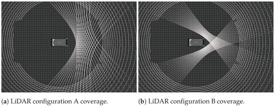 To detect the environment, a LiDAR sensor of 64 layers with a complete vision of 360 degrees was mounted on the roof of the vehicle. The device was lifted 34 cm to optimiee the maximum ring layer hitting the ground and avoiding as much as possible any point that will lay inside the roof of the platform. Additionally, two LiDAR of 16 layers were mounted in front of the vehicle with specific angles to cover the blind spots and to detect the road and the critical obstacles near the platform. Figure 9a shows the final distribution of the LiDAR 16 and 64 with the coverage in front of the vehicle. Figure 9b shows the initial alternative discarded for poor environment coverage and lack of road boundaries detection with bigger blind spots.