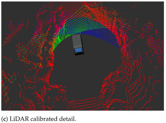 One of the main problems using three LiDAR sensors is the extrinsic calibration stage. All the LiDAR must detect, measure and show the same distance to the same set of obstacles. In the literature, some automatic method was developed for this task such as the work of pairing stereo camera and LiDAR or directly pairing LiDARs. For the initial stage of extrinsic calibration, the method of Guindel [13] has been used in the LiDAR variant. The result has been tested in an industrial warehouse with three walls and the floor. With a little tuning, the final output of the whole process has been proven to be optimal enough as observed in Figure 9c. Furthermore, it is possible to appreciate the shared space of the LiDAR sensors on the floor or by pairs in the sides.