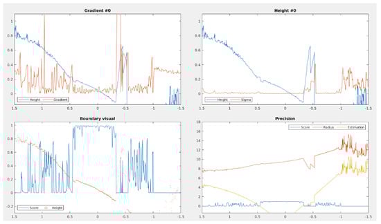 The top left of Figure 10 shows the gradient in height of the data information for only one ring. In the top right, the sigma value is the relative height based on the medium deviation of the previous data for the same ring and by taking into account the displacement. The bottom left indicates the score. Finally, the bottom right shows the precision of the score based on the estimation of the regression with neighbours.