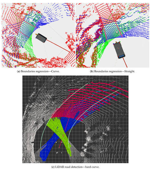 In the second iteration, with the boundaries already computed, this method generates a 2D model of the road with a mean-square fit that uses the selected scored points for each ring (taking into account a threshold) as a regression method to extract the road limits. This regression is performed in two steps to provide more accuracy: the first step computes a rough draft of the road limits and then, the second step applies a filter to smooth the curve and extract the outliers. In this manner, the road boundaries extracted can determine the position of the vehicle in the road and, therefore, it is possible to generate the lateral control commands to drive the vehicle inside the road bearing in mind the solutions provided by the detection algorithm. The method proposed for road detection works with straight and curved roads (Figure 11a,b) determining the navigable space for the vehicle (Figure 11).