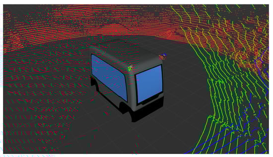 One small problem using LiDAR in the platform is to optimize the position to balance the rings hitting the vehicle versus the height position in the roof and blind spots in the surroundings. Consequently, there are some auto-hits of the lower rings in the corners of the vehicle and some laser collisions in other LiDAR devices, as can be observed in Figure 12. The solution proposed results in the use of a filter with the shape of the platform to erase undesired points in the final point cloud. Moreover, sometimes the LiDAR sensors may have false positives and present random points in front of the sensor due to systematic errors, interference or fog. For this reason, an additional filter is applied to the point cloud in the critical area near the vehicle in order to avoid processing those ghost points and detecting them as obstacles in front of the bus.