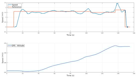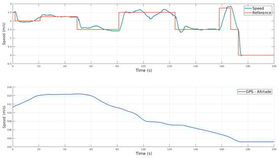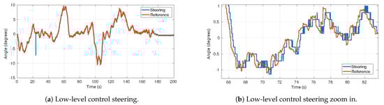 As previously specified, the low-level control of the vehicle is the original control from the EZ10 LIGIER model. On one hand, the speed reference, acceleration and steering angle are generated from high-level modules and the vehicle can follow the reference as Figure 18 for uphill and Figure 19 downhill where it shows the reference velocity generated from the high-level control and the current speed. Additionally, Figure 20a shows the steering angle commands generated from the lateral control and the current steering angle where Figure 20b is a zoom-in of the same figure. It is possible to appreciate the following action of the steering wheel. Depending on the slopes, accelerations and speed configuration, the vehicle is able to follow as commanded with no additional control steps performed by the team. On the other hand, the system implements two nodes generating control commands for the platform to follow the path. One is based on localization and path planning, which is the Model predictive controller (MPC), and the second one is based on road detection and both methods were described in the former sections. However, the important part here is how the vehicle decides which control method to trust and that is performed by considering the score computed in Section 3.1.2 that is in charge of processing sensor data, allowing the platform to switch between the controllers used in this particular instance of the software architecture. The primary option, if the score is higher than a threshold, is the MPC method due to its robust performance. However, if the localization score computed from odometry is not high enough, the control manager will not trust any command sent by the MPC and the reactive road controller will provide the commands for the vehicle. This method was proved sufficient to computed in practice where the threshold limits must be placed in order to manage the control inputs. Furthermore, there is a more important fact here to bear in mind and it is related to how the covariance estimations of the Odometry and Road detection modules are computed, which that goes out of the scope of this work. While other solutions may want to complicate this problem unnecessarily, this particular approach turned out to be sufficient in order to ensure good navigation with unnoticeable recovery behaviours. Although it must be stated that once the system proposed is enhanced with new control and localization methods, it would be advisable to improve this selection method with more suitable approaches.