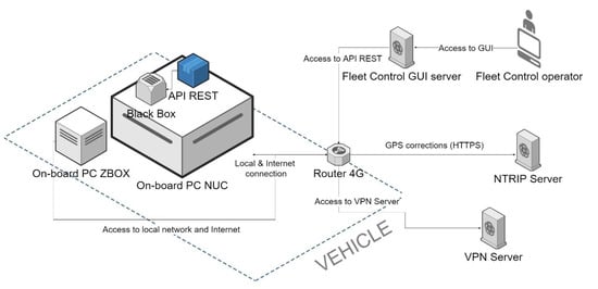 - The 4G router. The equipment mentioned above is connected to a router by a local gigabit ethernet network and the Internet by 4G connectivity through this same device. Requests made to services that run on vehicle computers will arrive through this infrastructure.