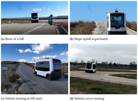 This work is the culmination of a full revision of the state of the art works regarding automotive transportation and autonomous electric vehicles. The approach proposed with the configuration and setup described above is suitable to work in places where there are a high number of repetitive tasks. The software architecture can manage all the information between both computers and the low-level control without any problems. The schedule in real-time for ROS messages are 100% processed rate and the rate to process the information from the callbacks in the distribution and post-process nodes are 100% guaranteed. This system is intended to work in tourism areas, airports, business centres, testing grounds and similar places with or without mixed traffic. The modular software architecture allows the inclusion and modification of workflow to adapt itself to new applications and tasks. Therefore, for the localization problem, a switch approach between an Odometry controller and a Reactive Road Controller has been enough for 4G/DGPS shortage zones. The detection of static and dynamic obstacles is solved using the LiDAR specific configuration with the PCL filters and the dynamic mapping processing. For the lateral and longitudinal control approach, the MPC and PID controllers at low speed are enough to drive safely and robustly. Finally, for the cybersecurity aspects, the VPN, port management and API-Rest are enough to block any attack. The selected environment to test the performance of the system differs from common environments in which the platform was tested and used. In this case, instead of structured urban environments, the vehicle was forced to cope with complex terrains that contain narrow roads, tight curves and hard slopes; this use case was intended to push the vehicle and all its system to the limit, resulting in excellent outcomes when it comes to architecture and system performance. However, it must be stated that the necessity of better and more robust mechanisms are required that focus on the power consumption and the electric engines limitations of a platform that is intended to face hard slopes and a set of demanding and repetitive tasks. All of these aspects must be taken into account while paying attention not only on the wear and tear of the mechanism involved but also in reducing the gap between the possibilities that both software and hardware elements provide in a coordinated environment. As a final remark for this conclusion, Figure 23 shows the testing tracks where the majority of the data has been obtained.