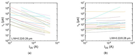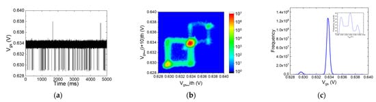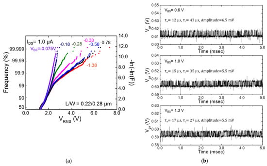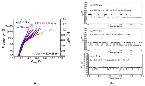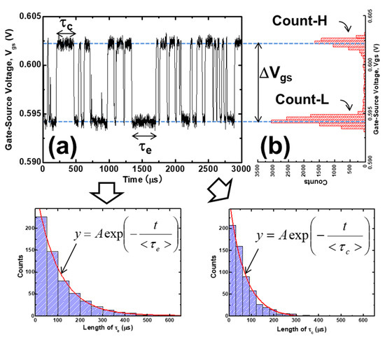 - Fujisawa, T.; Abe, K.; Watabe, S.; Miyamoto, N.; Teramoto, A.; Sugawa, S.; Ohmi, T. Accurate Time Constant of Random Telegraph Signal Extracted by a Sufficient Long Time Measurement in Very Large-Scale Array TEG. In Proceedings of the IEEE International Conference on Microelectronic Test Structures, Oxnard, CA, USA, 30 March–2 April 2009; pp. 19–24. [Google Scholar]